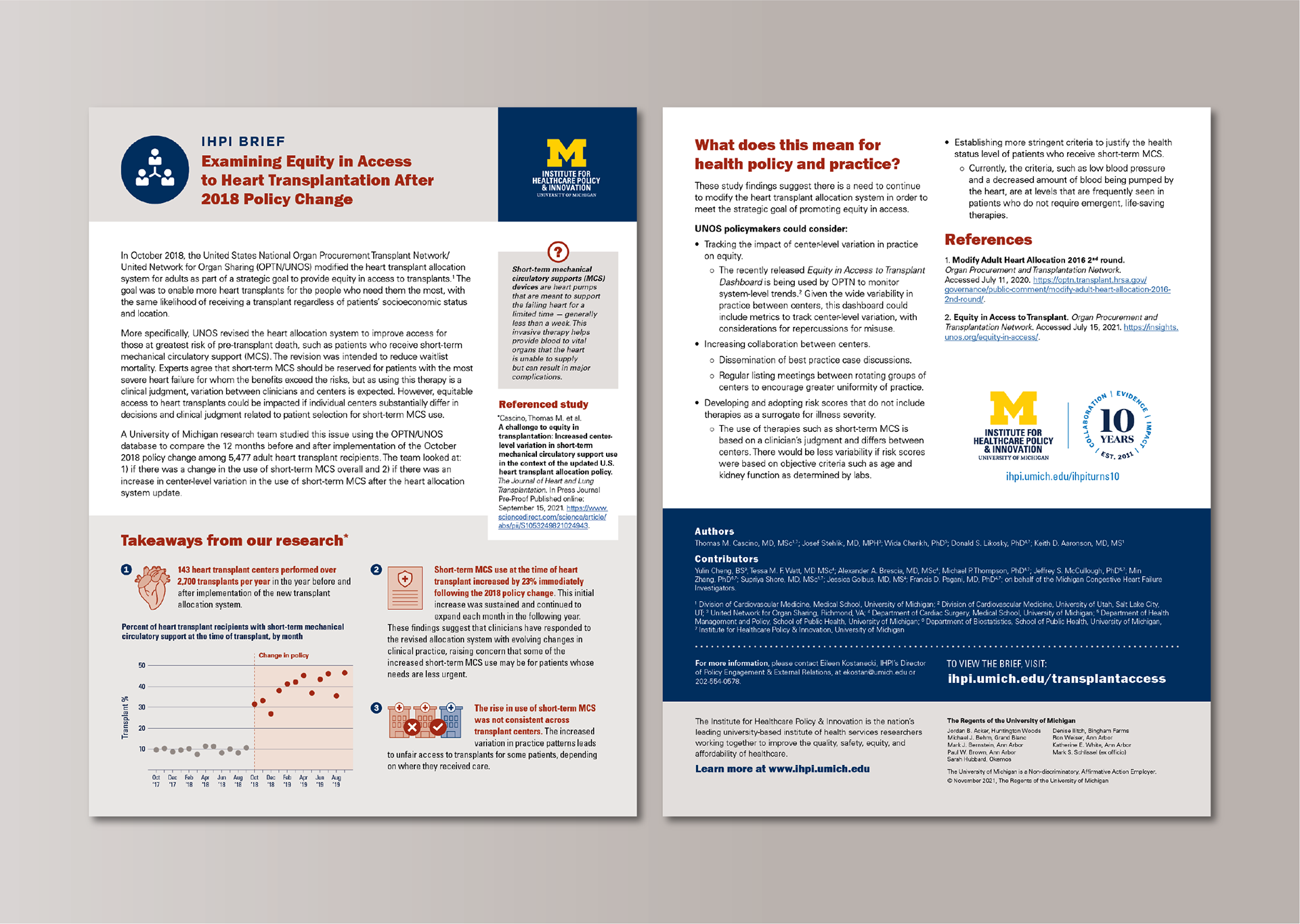 Examining Equity in Access to Heart Transplantation After 2018 Policy Change (November 2021), view brief at www.ihpi.umich.edu/transplantaccess